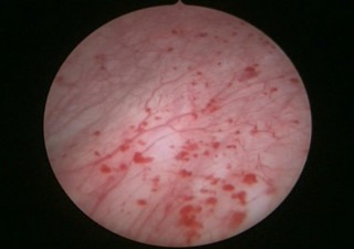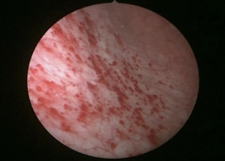 間質性膀胱炎在膀胱鏡底下可以看到很明顯出血,如下圖所示